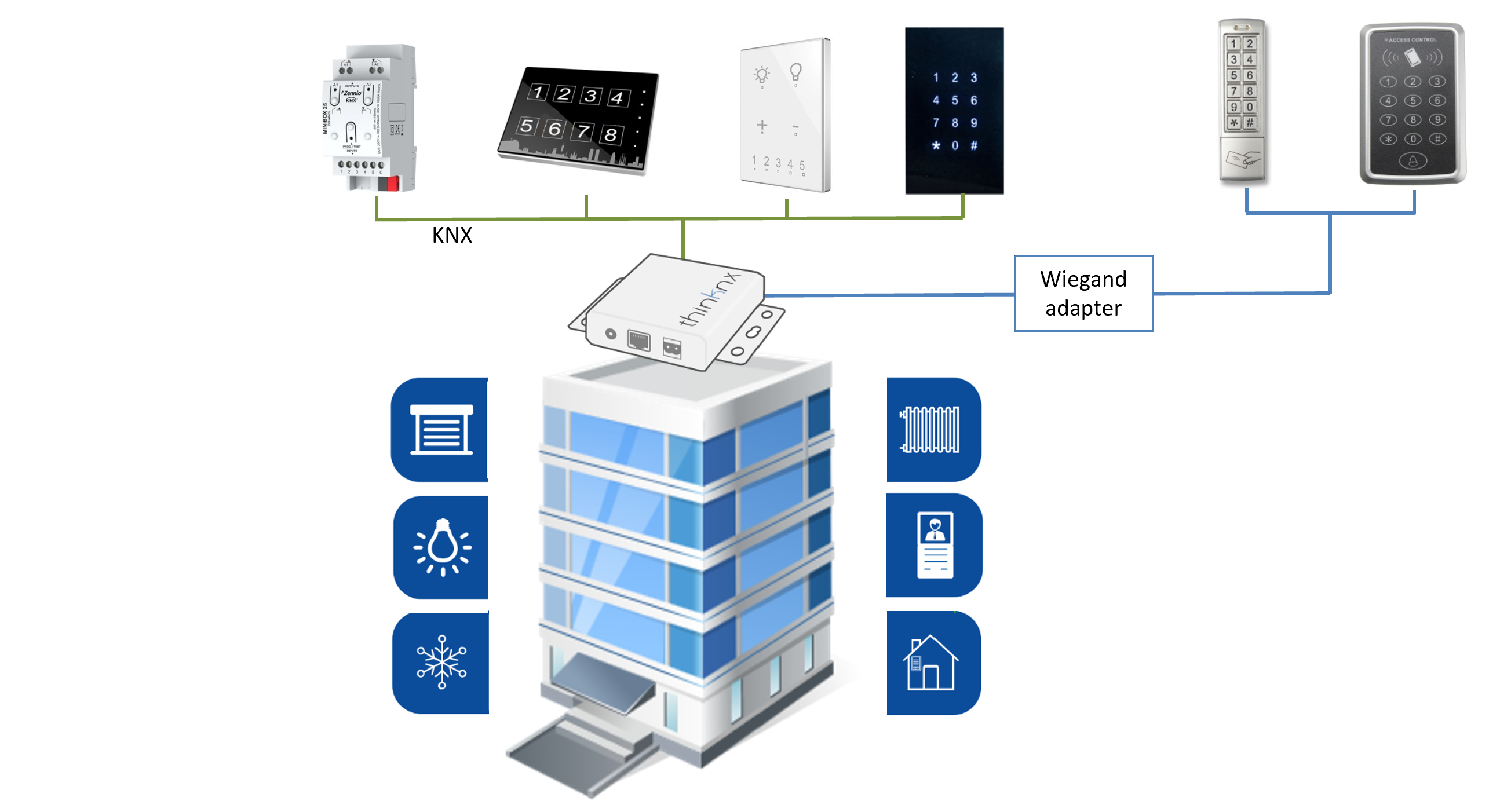 The Access Control object can communicate directly with the KNX system through Thinknx server, making the integration very easy and flexible. Any standard KNX keypad can be used as an access keypad, and its buttons as code entries. Once the code is inserted, it is possible to operate a lock or switch on a KNX actuator. In addition, communication with Wiegand technology is possible through the Thinknx-Wiegand adapter, making it possible to install a suitable RFID or biometric reader.