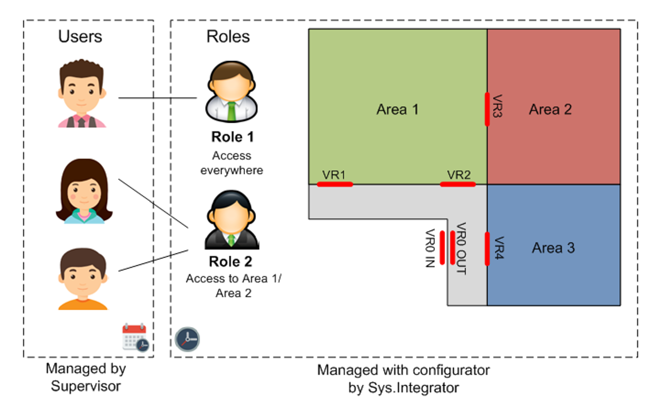 - Possibility to create different Roles, with predefined privileges to access specific building areas. Any new user shall be assigned to a preconfigured role and will receive the same access rules as this role.