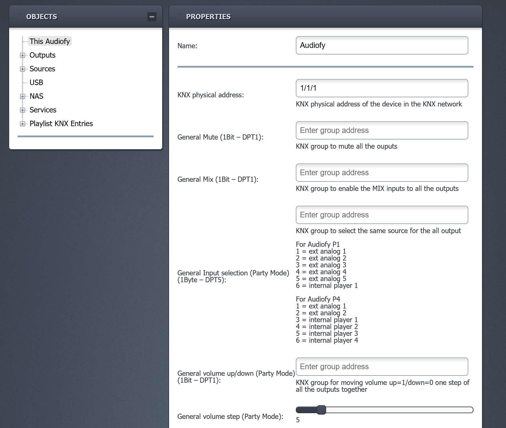 General volume up/down 1-bit - DPT1. KNX group for moving volume up=1/down=0 one step of all the outputs together. Step is defined in the General Volume Step slider below this field.Public Announce select 1-byte - DPT5. KNX group to launch a precise playlist to all the outputs (KNX values that will be used to recall the playlist must be defined in the “Playlist KNX Entries” node, association between playlists and KNX values must be defined in the Audiofy app). Player 1 will be used for playing the music.KNX group stop PA 1-bit - DPT1. KNX group for stopping alert playing or PA playlist playing.Alert tone selection 1-byte - DPT5. The following tones are available:- 1 = Dingdong