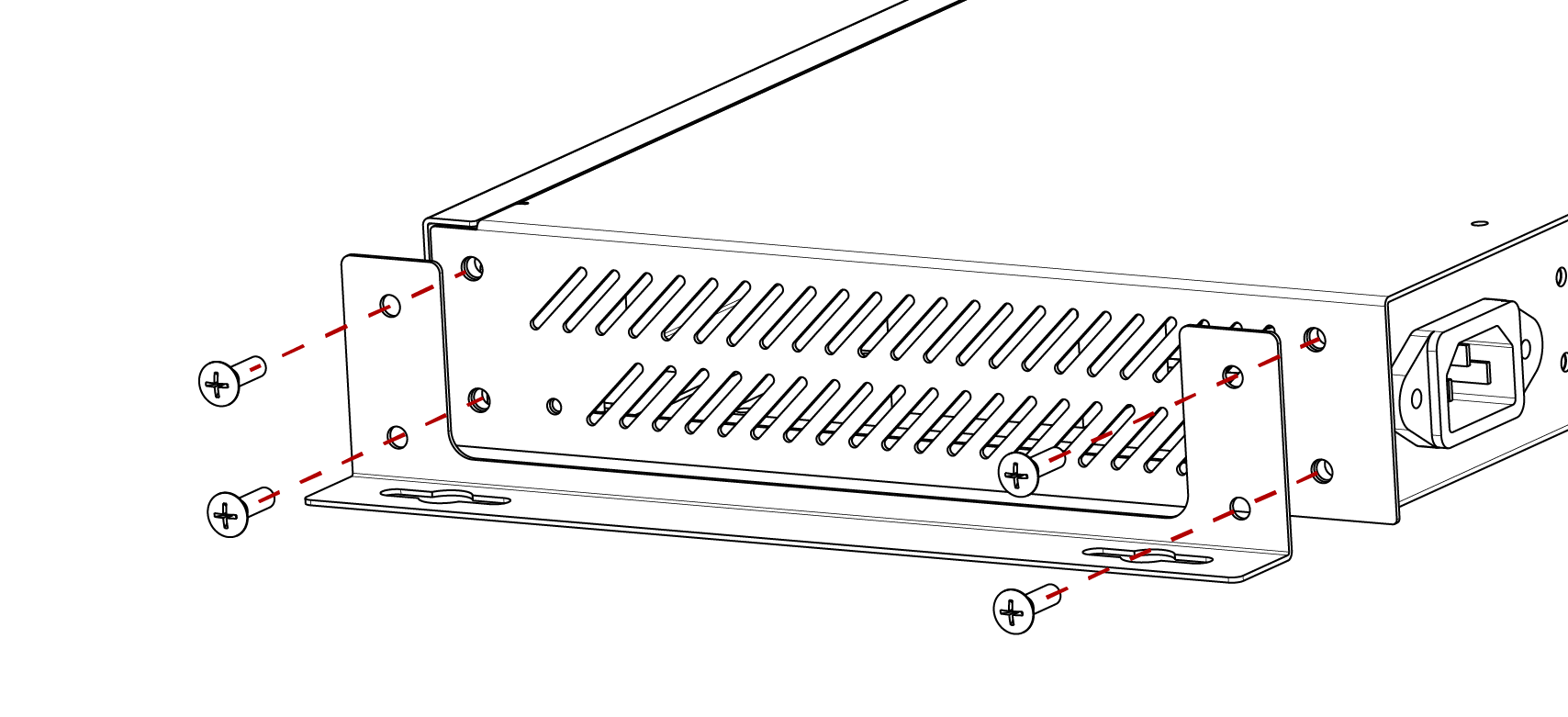 This device can be installed into a 19” rack cabinet (1 unit) thanks to its rack ears, or to a wall thanks to its brackets mount. In the following pictures you can see how to mount the proper brackets to the audiofy unit. Please use only the provided M4x8 screws to avoid internal damages to the unit.