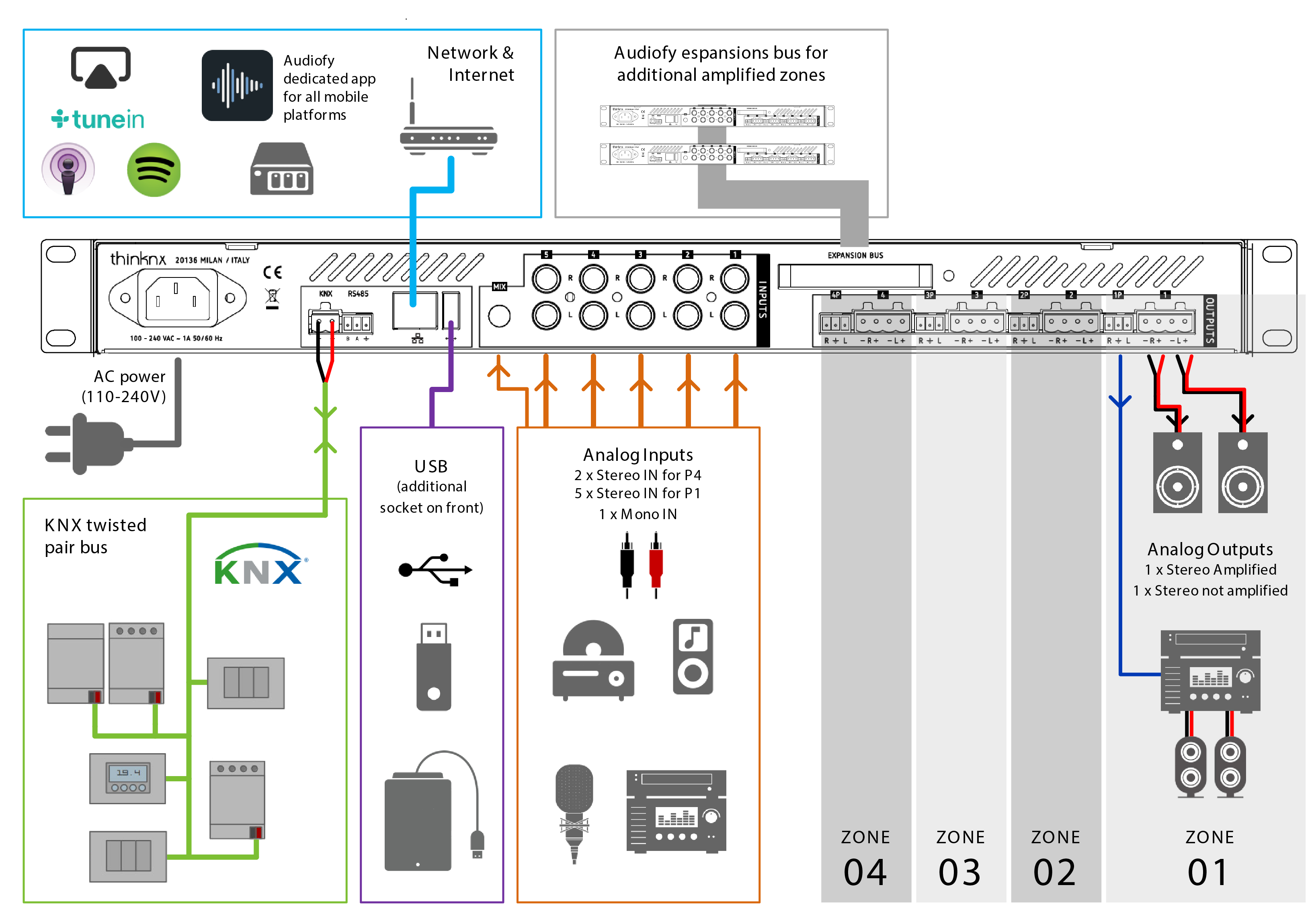 Audiofy is not only a professional audio multi-room system but your all-in-one solution for the complete control of home and building automation. Just with one device you can stream music contents from internal players or analog stereo inputs and manage in the same time all the functionalities of Thinknx supervision system from lighting and heating & cooling, to audio and music. Moreover, thanks to the integration with voice control devices like Apple Home Kit and Amazon Echo, you’ll directly turn on or off all the commands using your voice. Through the native KNX TP port, Audiofy acts as every Thinknx controller allowing a bidirectional interaction with the plant. The new software update and the graphical restyling make the Audiofy app much more intuitive, faster and easy to use for every iOS and Android mobile devices, maximizing the performance level of the system, for a complete customer user-experience.