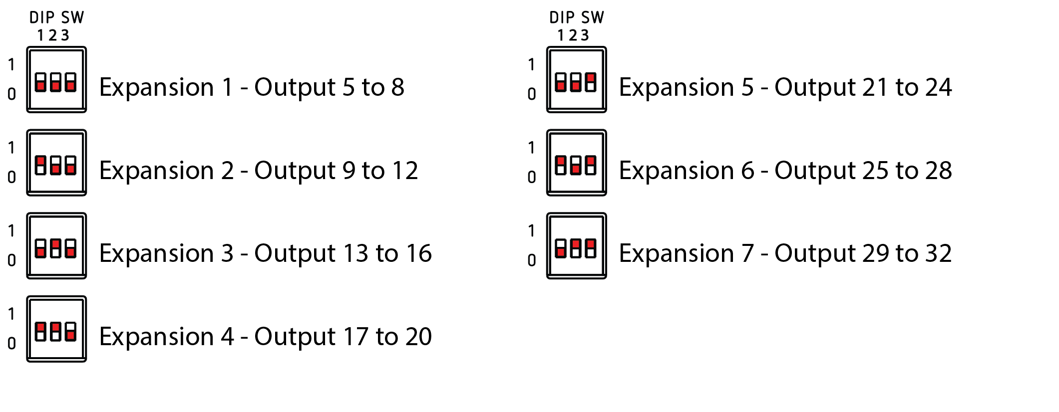 Each expansion must be set to a different address using the DIP switches on the back. Please follow the picture below to identify expansion properly.