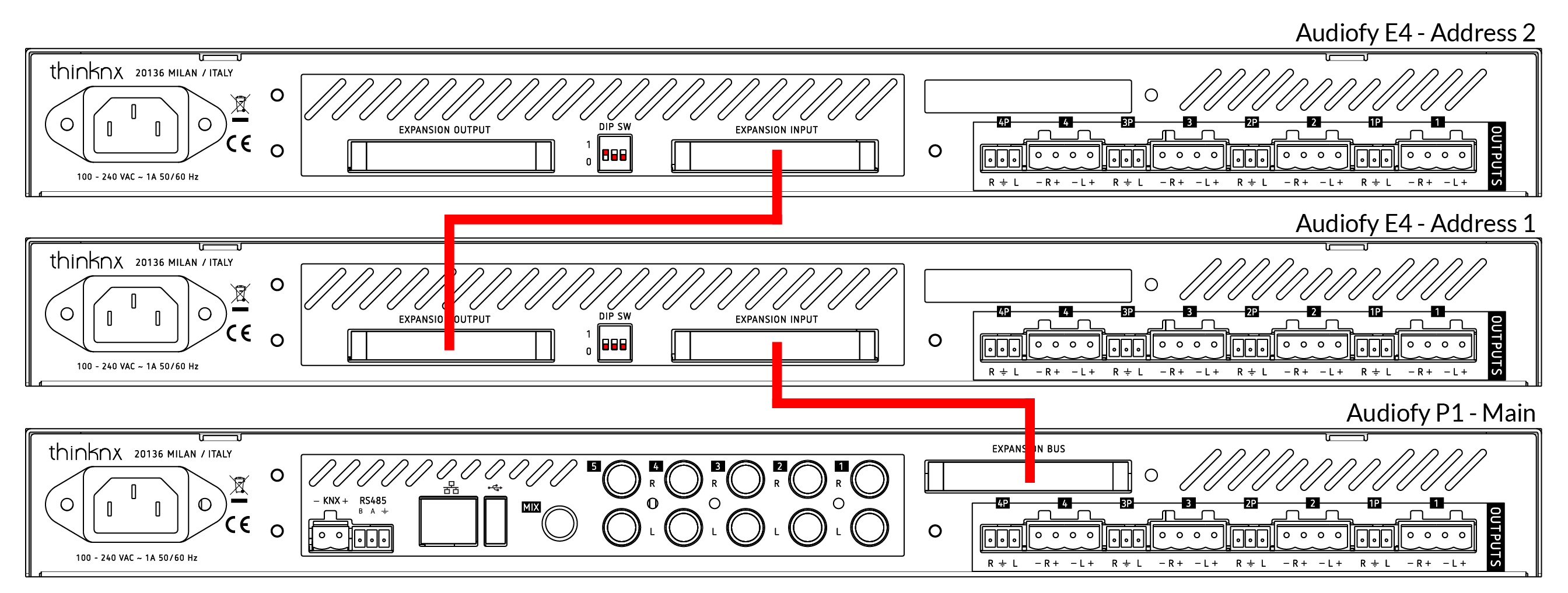 To expand the system and use the Audiofy E4, proper connections must be done between the master device (P1 or P4) and the expansions. The master device must be connected to the first expansion using the EXPANSION BUS connector and than all the other expansions must be daisy chained using EXPANSION IN - EXPANSION OUT connections like the picture below.