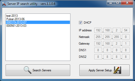 Once the Audiofy is connected to LAN it acquires an IP address given by the DHCP service. To discover the IP address assigned to the device, use the Thinknx UP Configurator by clicking on the bottom right section of the software where it reads “Click here to search for Thinknx devices”. After selecting the ThinKnx Audiofy installed, it is possible to disable the DHCP service and provide it with a static IP. Click on the ”Apply server setup” to confirm the changes. This step is recommended to avoid the loss of the IP address in case the connection is lost: in fact on connection recovery, the DHCP server could not assign the same address, causing problems between server and clients.