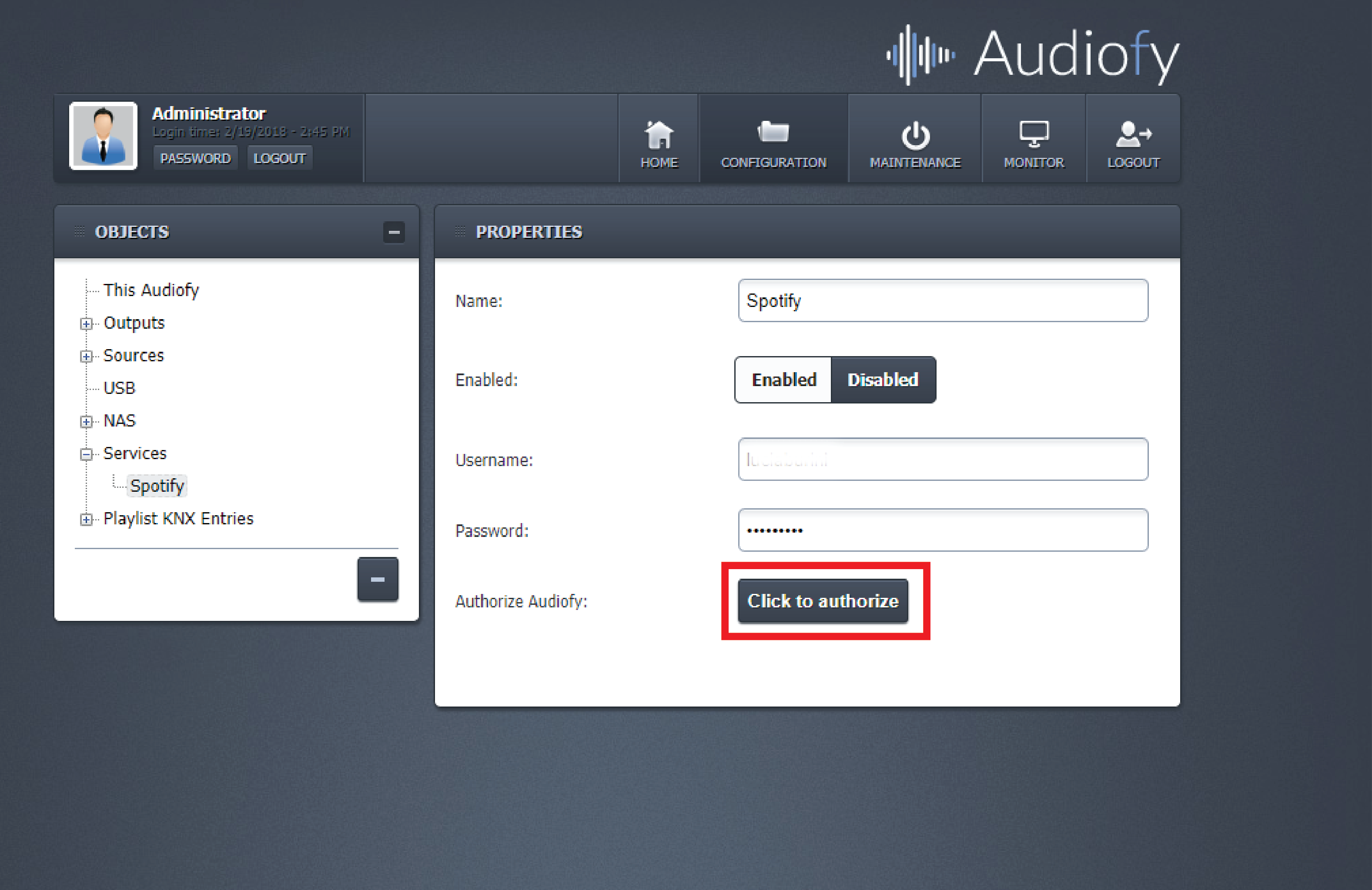 Once inside the Audiofy web page, go to the section “Configuration→Audiofy” and inside the “Services” node add a Spotify service. Now you need to enable it and enter your credentials. As a final step, to pair the Audiofy with your account you need to click on the “Authorize” button.