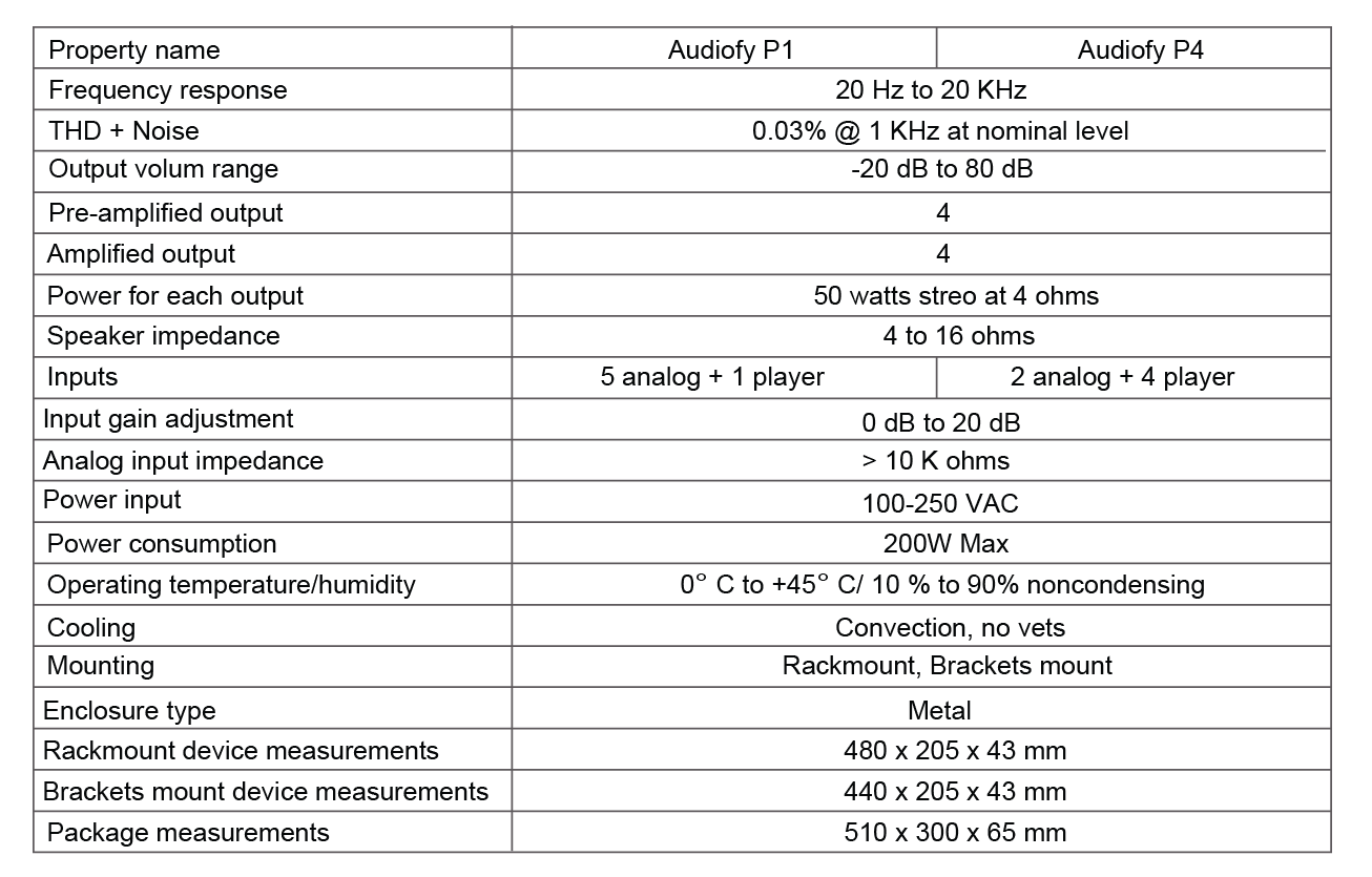 Audiofy is a scalable system which delivers music contents from internal players (up to 4) or analog stereo inputs (up to 5) to stereo power amplified outputs (from 4 to 32).