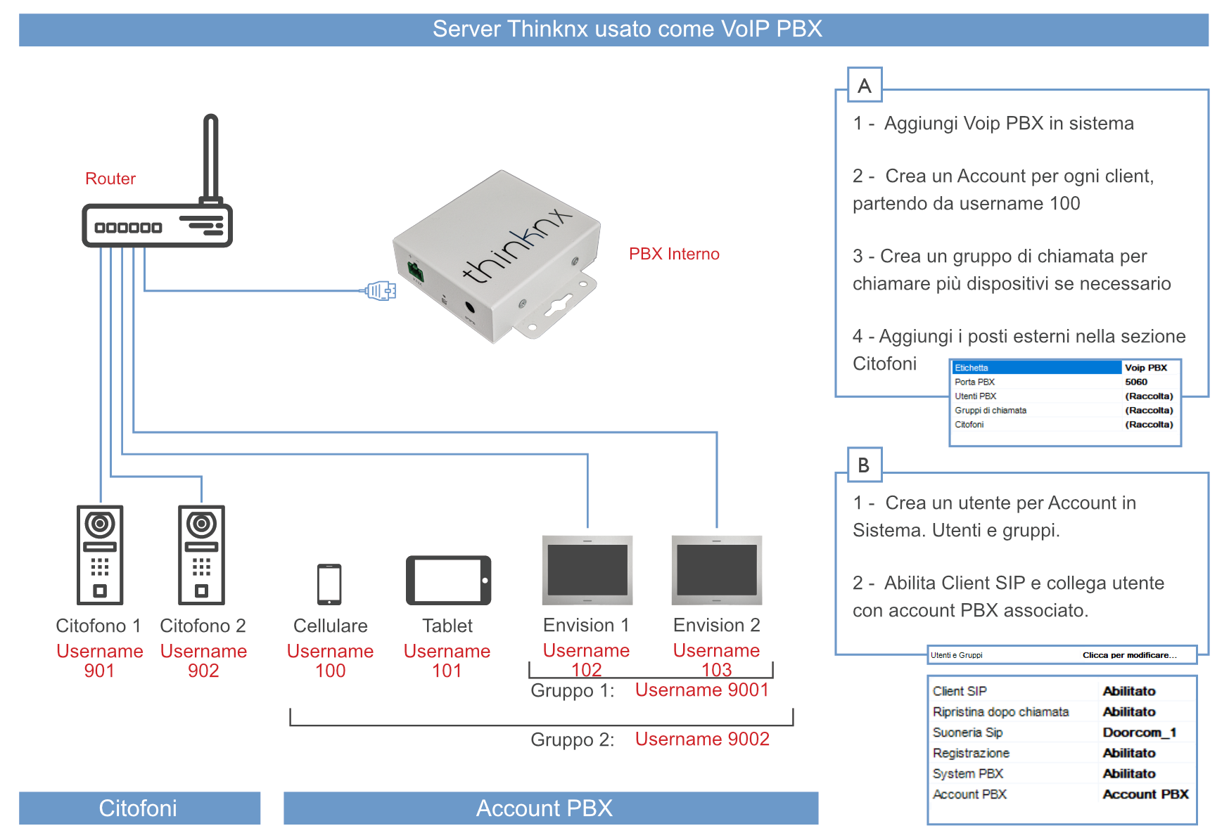 Ogni server Thinknx incorpora un software PBX telefonico VoIP. È ottimizzato per le funzionalità VoIP tra utenti e la comunicazione con i posti esterni. Questo oggetto consente di configurare il PBX (utenti,gruppi di chiamata e citofoni).