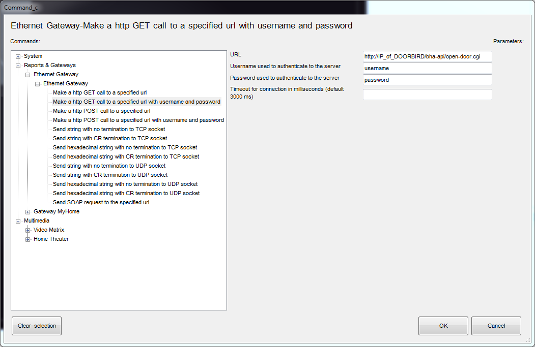 If you prefer to use html GET solution, you need to use the Thinknx Ethernet Gateway plugin and configure a Generic Button to perform an action with the following parameters: