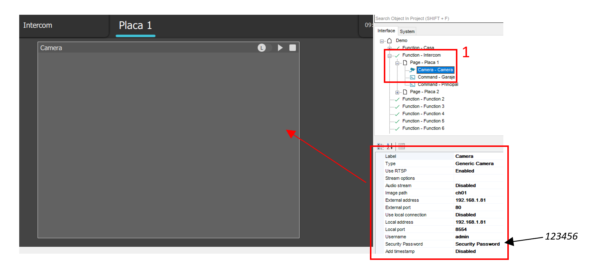 To be able to see the images coming from the device you need to add a Camera inside Thinknx UI and configure to grab images using the following parameters: