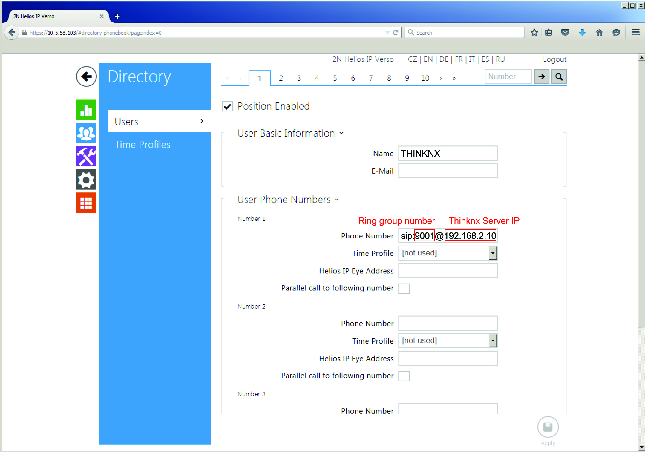 - Under User Phone Numbers→ Number 1→ Phone Number type sip:9001@x.x.x.x, where “x.x.x.x” is the IP Address of the Thinknx Server and 9001 is the extension number to call (ring group in this case).