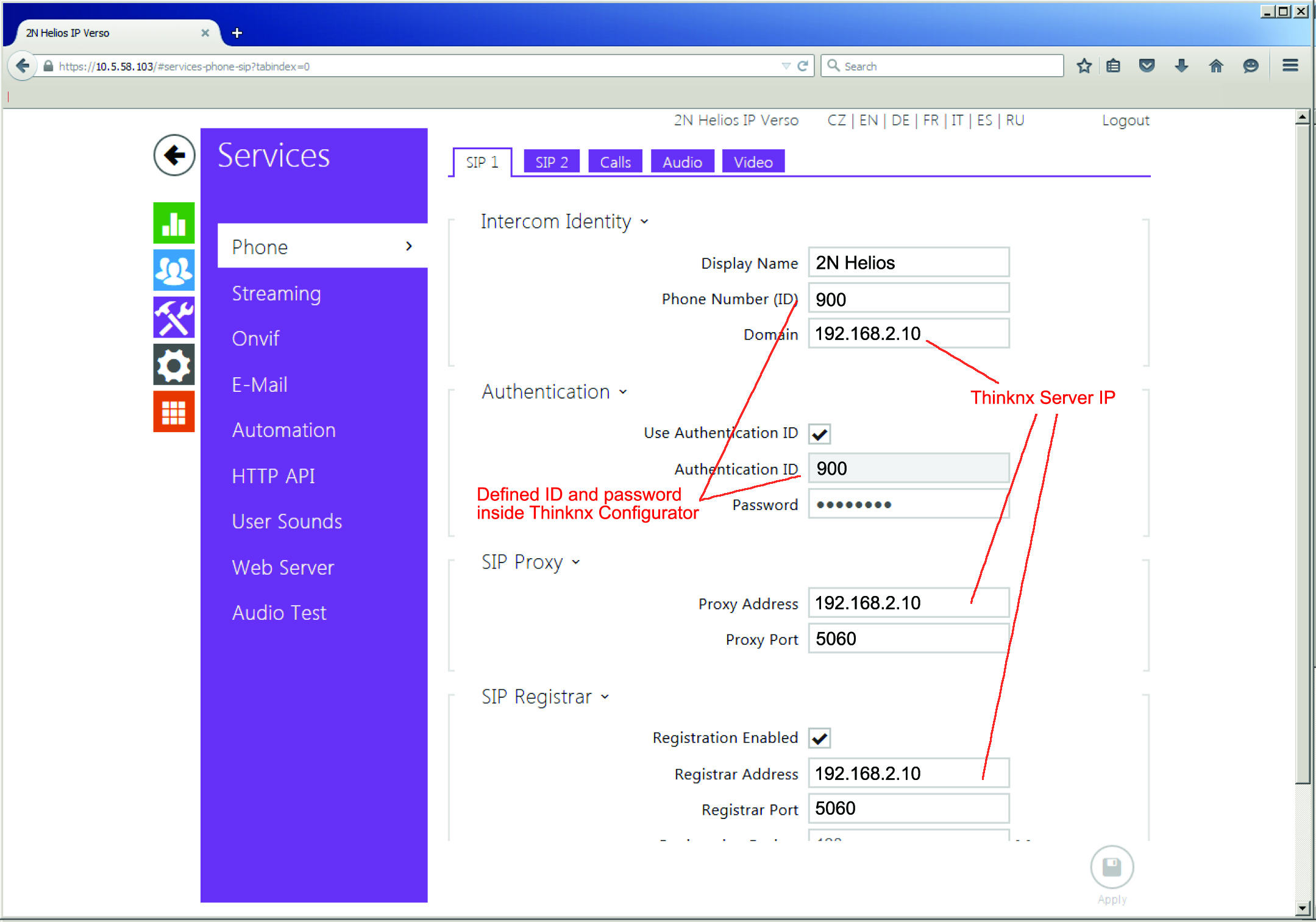- Proxy: sip:ipofthethinknxserver.