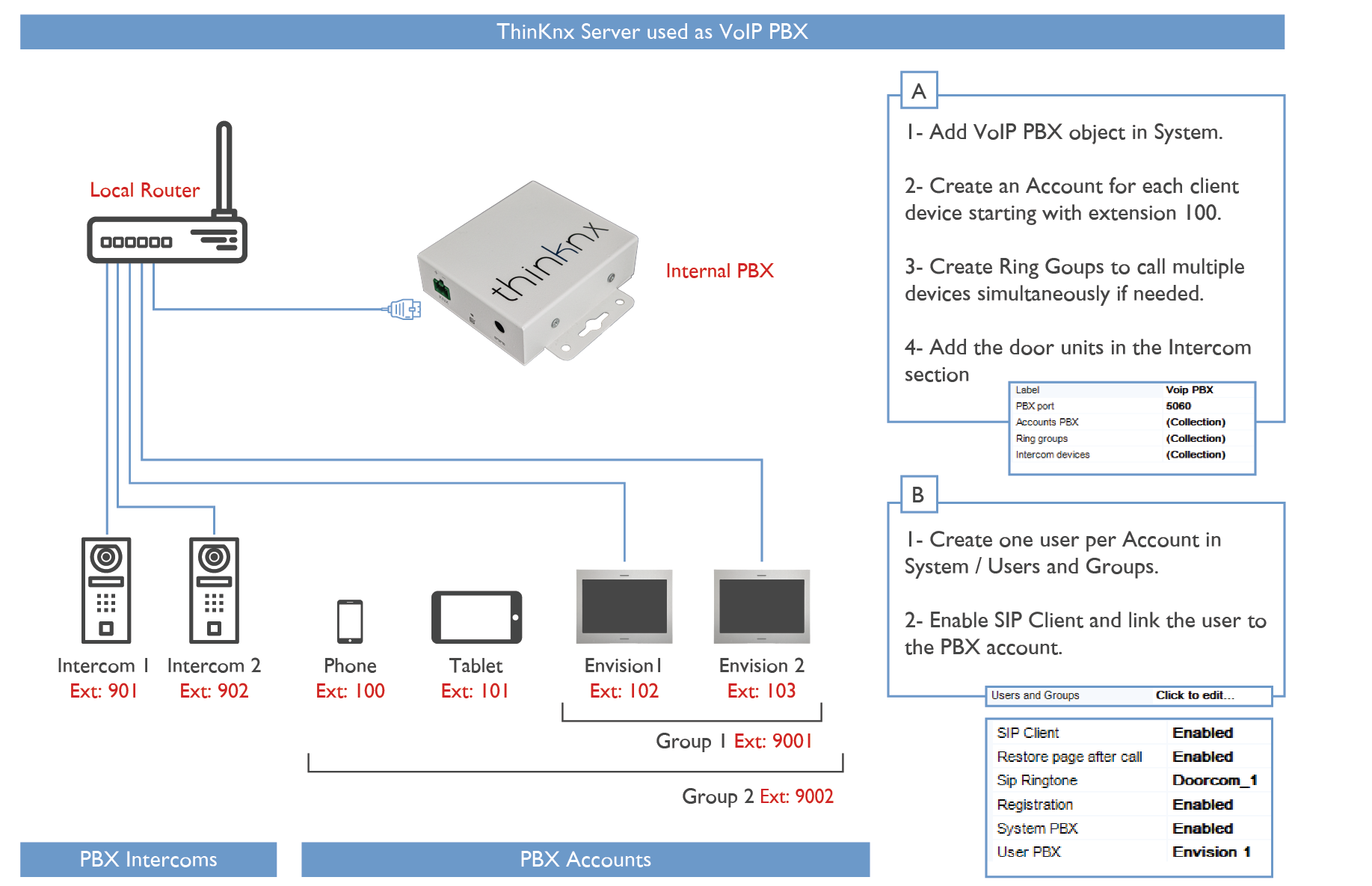 The diagram below gives a general overview on the configuration when using a Thinknx server as a VoIP PBX.
