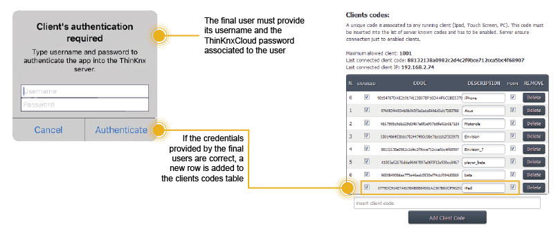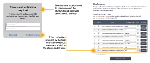 The procedure to authenticate client devices always requires the effort of installers to access the server web pages and to manually add the last connected client code to the table of enabled clients. To save time to installers and leave more indipendence to final users, it is now possible to authenticate the client directly from the app through a simple popup. To use this feature the ThinKnxCloud must be enabled and the users must be configured (each user with its own cloud password) in the project. It is enough to enable the “Automatic authentication” property in the System node and to upload the project to the cloud (if the Automatic server update is disabled, remember to upload it also on the server!). Then, when an unauthenticated client connects to the ThinKnx server, a popups appears in the app asking for credentials. If the credentials provided by the users are correct, a new row will be automatically added in the table of enabled clients in the server web pages.