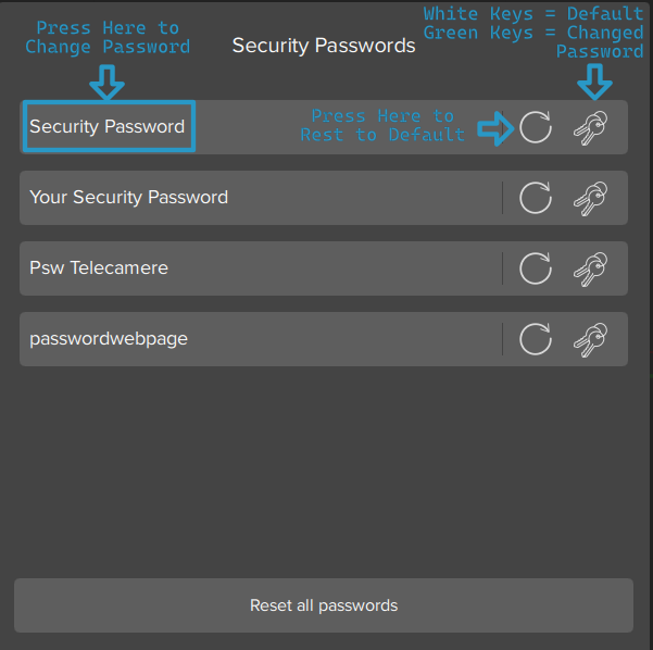• Press the circular arrow icon to restore the selected password to its factory default value.This operation overrides any previously applied modifications returning to default setting.