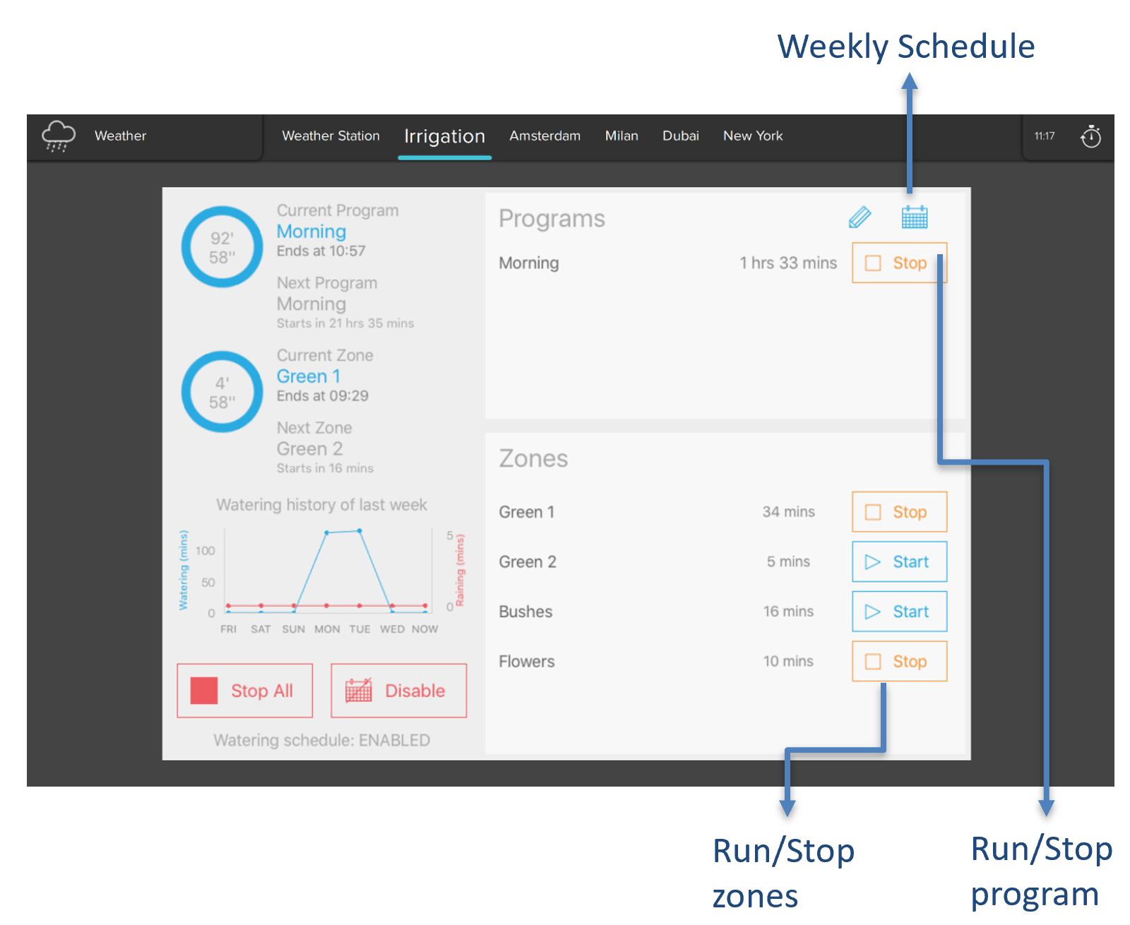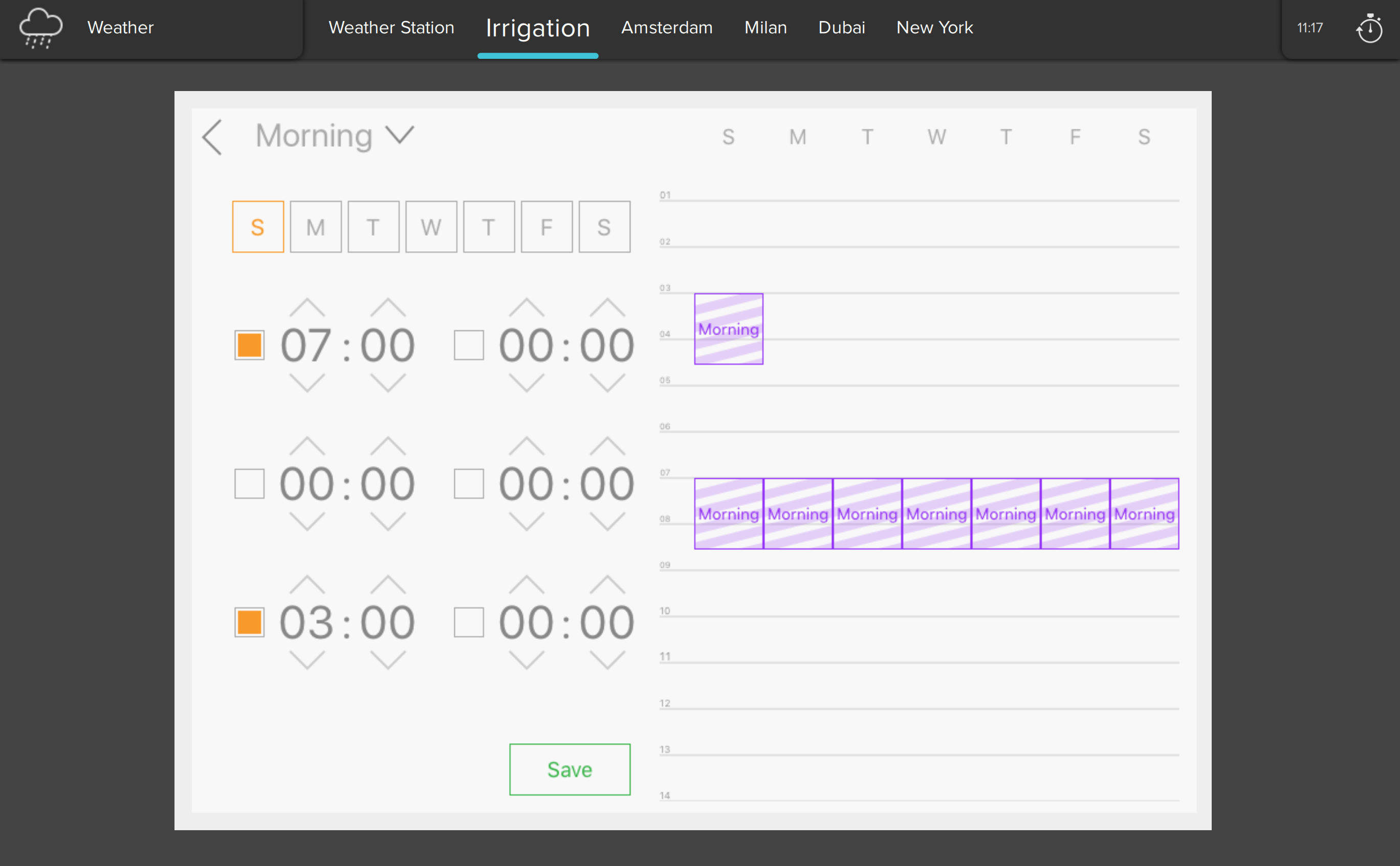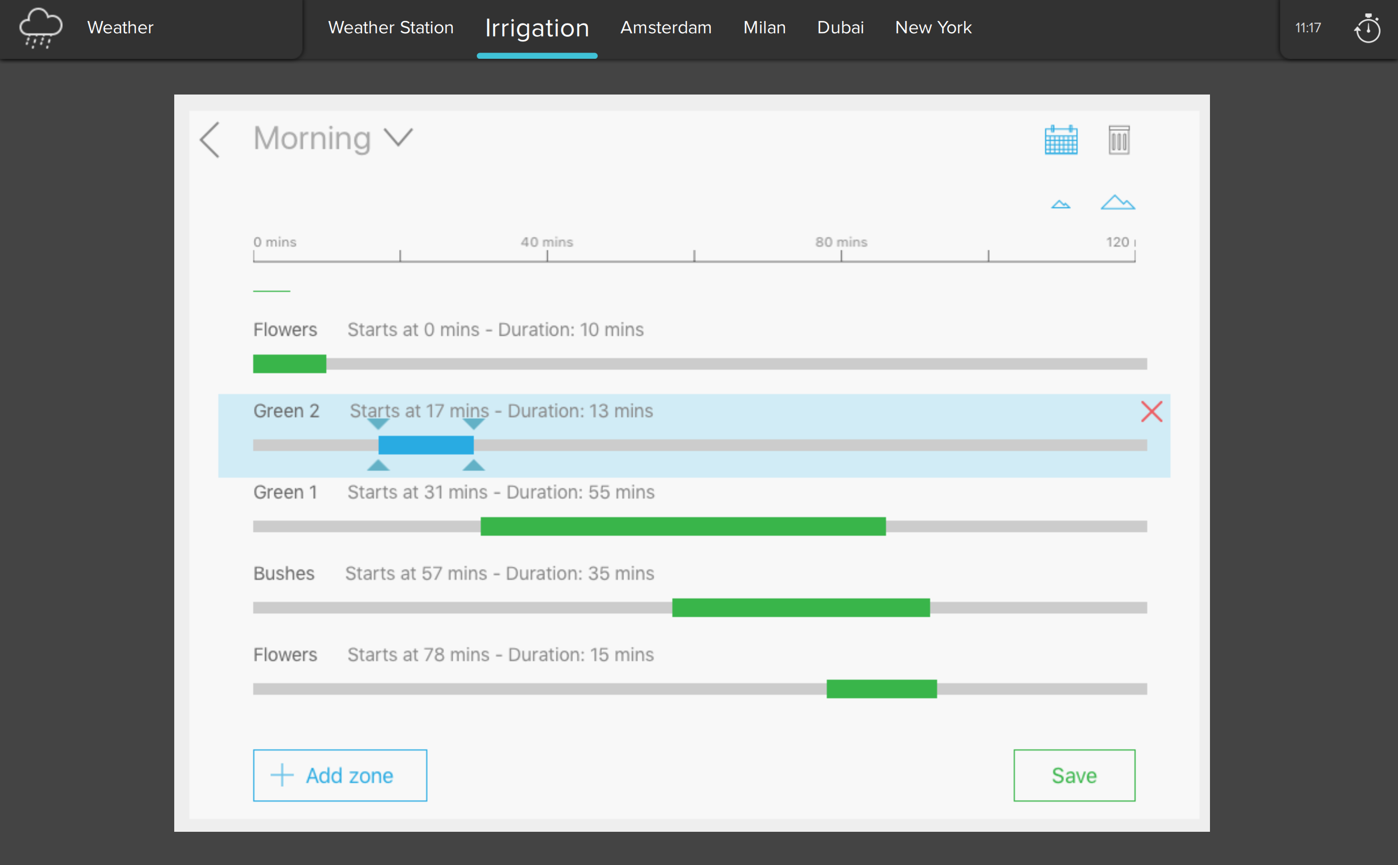 When creating an irrigation program, such as the Morning program, the user can add the zones and easily input the start and finish time of the irrigation for each zone.