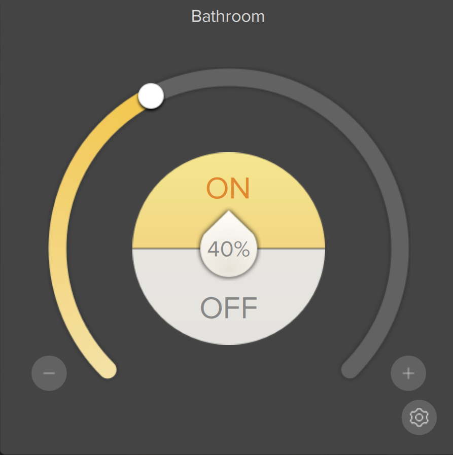 To control a dimmer, a click on the corresponding icon will open a popup allowing the user to send an ON/OFF command or choose the dimming value by moving the slider around the buttons.