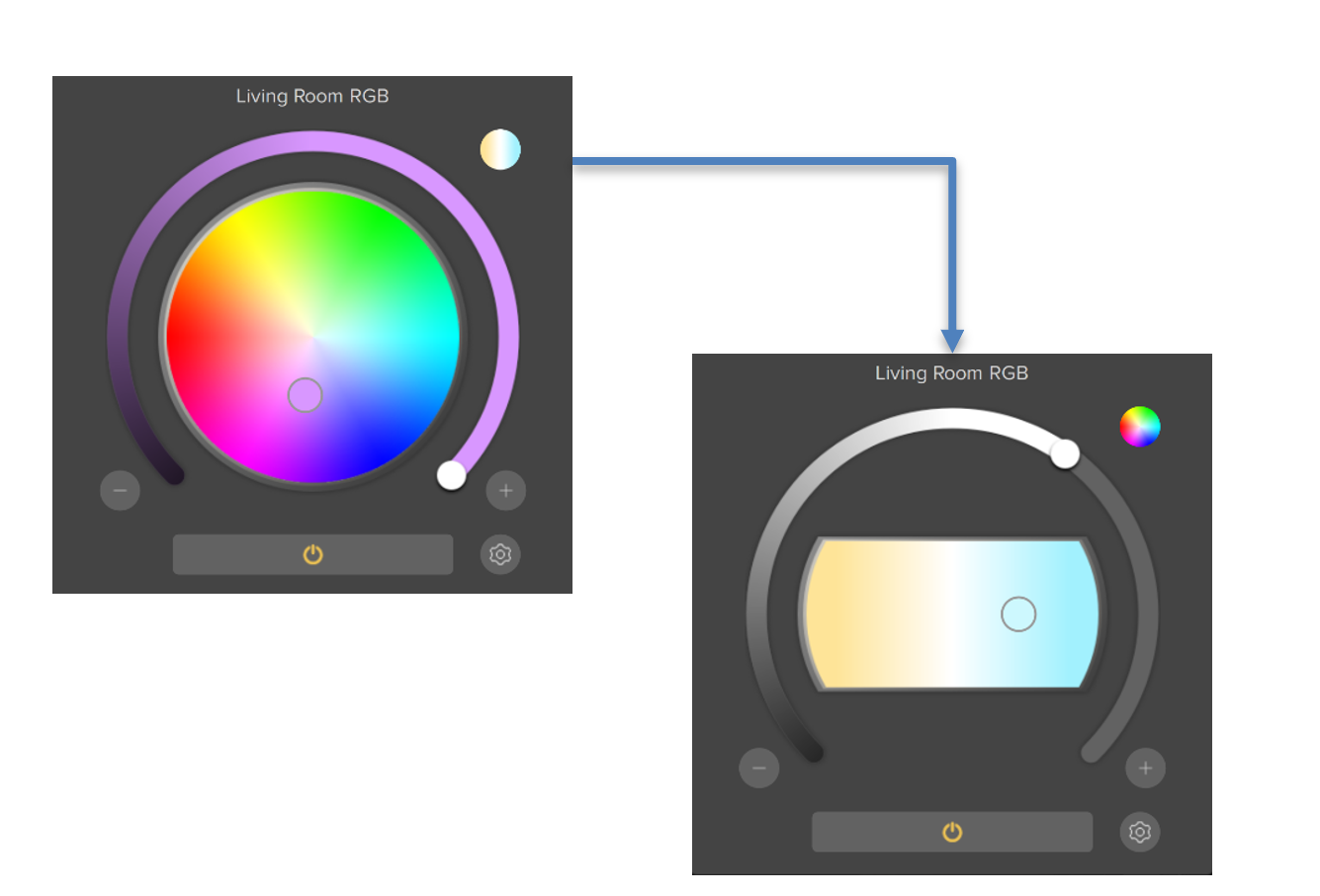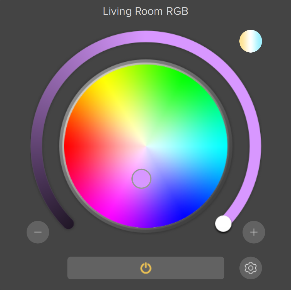 To control an RGB light, a click on the corresponding icon will open a popup allowing the user to select the color from the color wheel and control the brightness by using the slider.
