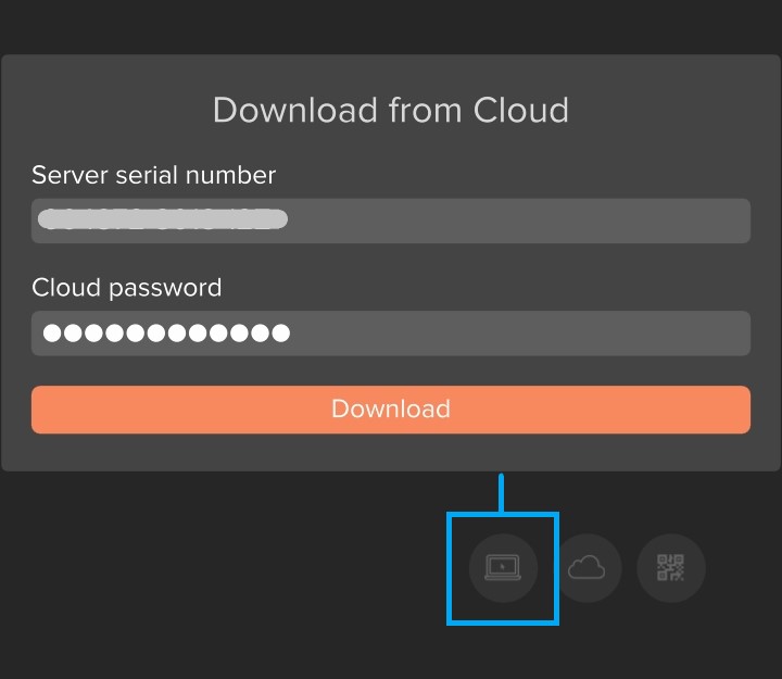 • Using Thinknx Cloud This can be done by the client without the presence of the installer. However, the installer will have to provide the client with the correct serial number and password. The client can click on the “Cloud” icon, enter the serial number and password, and click on Download. Once the download is completed, the project will show in the list to the left.