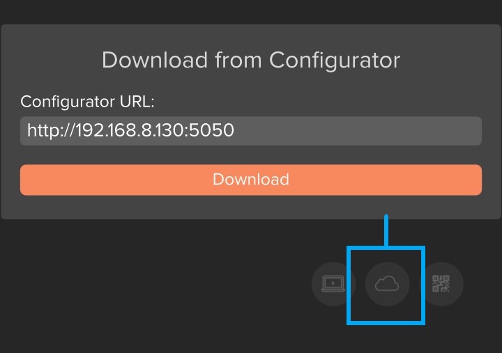 • Using the local network This can only be done in the presence of the installer or any person who is able to open the project file with the Thinknx Configurator. The URL provided by this person can be entered inside the corresponding field after clicking on the “PC” icon in the client application followed by port 5050. The project will then be downloaded using the same network as the Thinknx server.