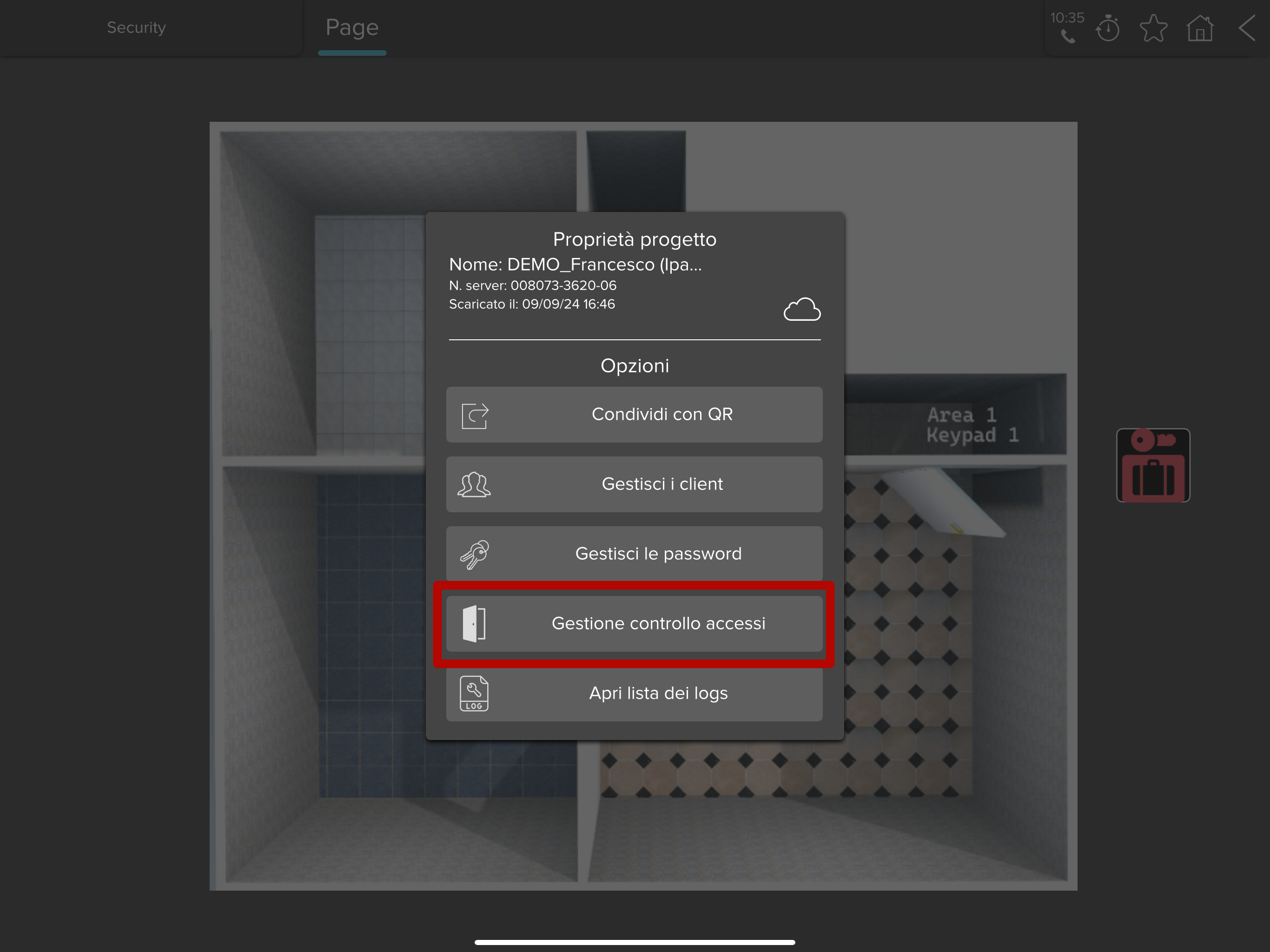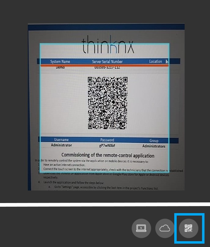 • using a QR Code The client can easily download the project by clicking on the “QR Code” icon and scanning a QR code shared by the installed by email/pdf. A permission should be granted to the Thinknx application to access the device's camera.