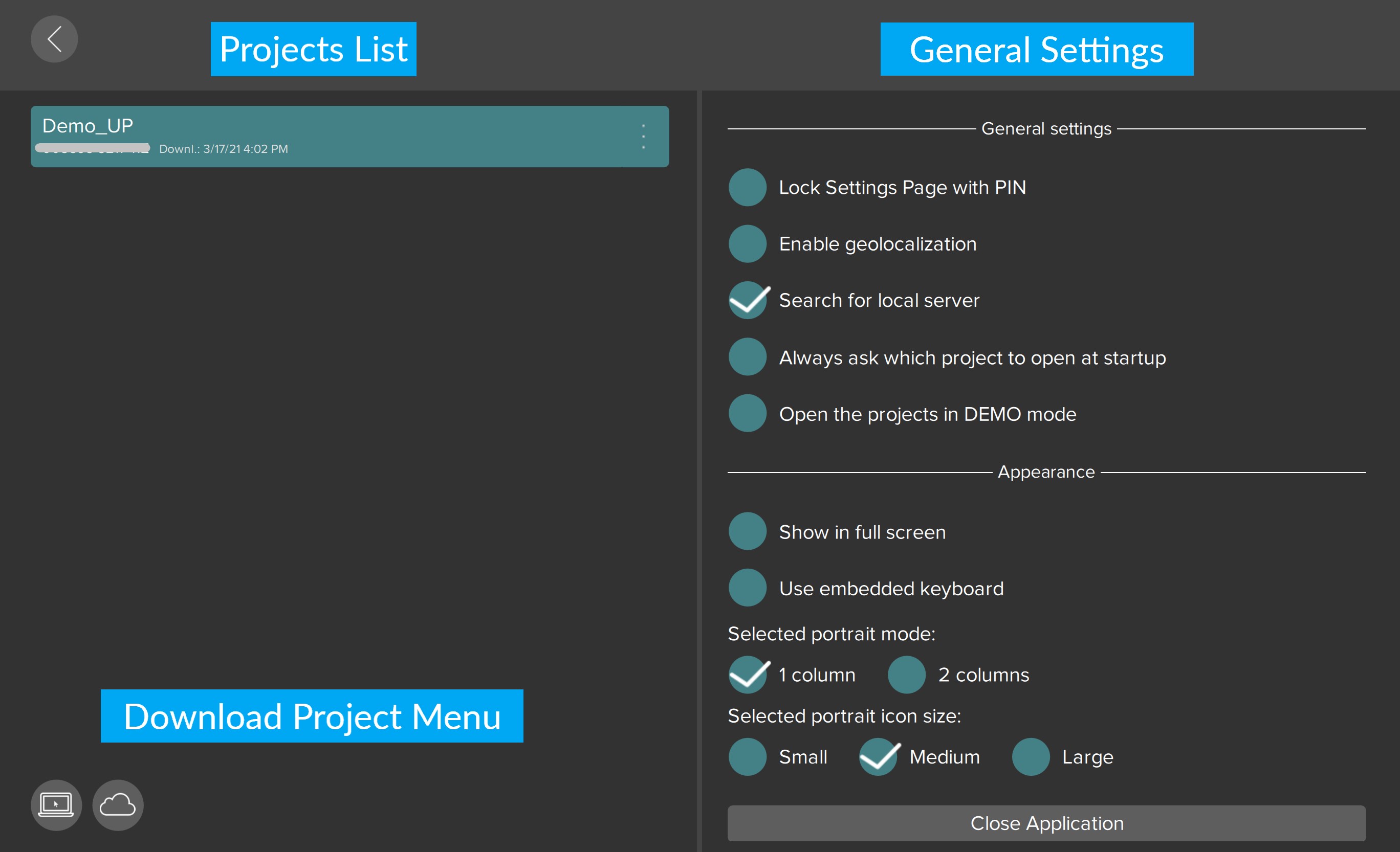 The settings page consists of the projects list located to the left, and the general settings of the project located to the right. These settings will allow the user to modify the appearance, change volumes, language and even update firmware if applicable. At the bottom of the page, multiple buttons are available to download a new project onto the client device using different methods (locally, through serial number and Cloud password, or using a QR code, if applicable). Settings Interface