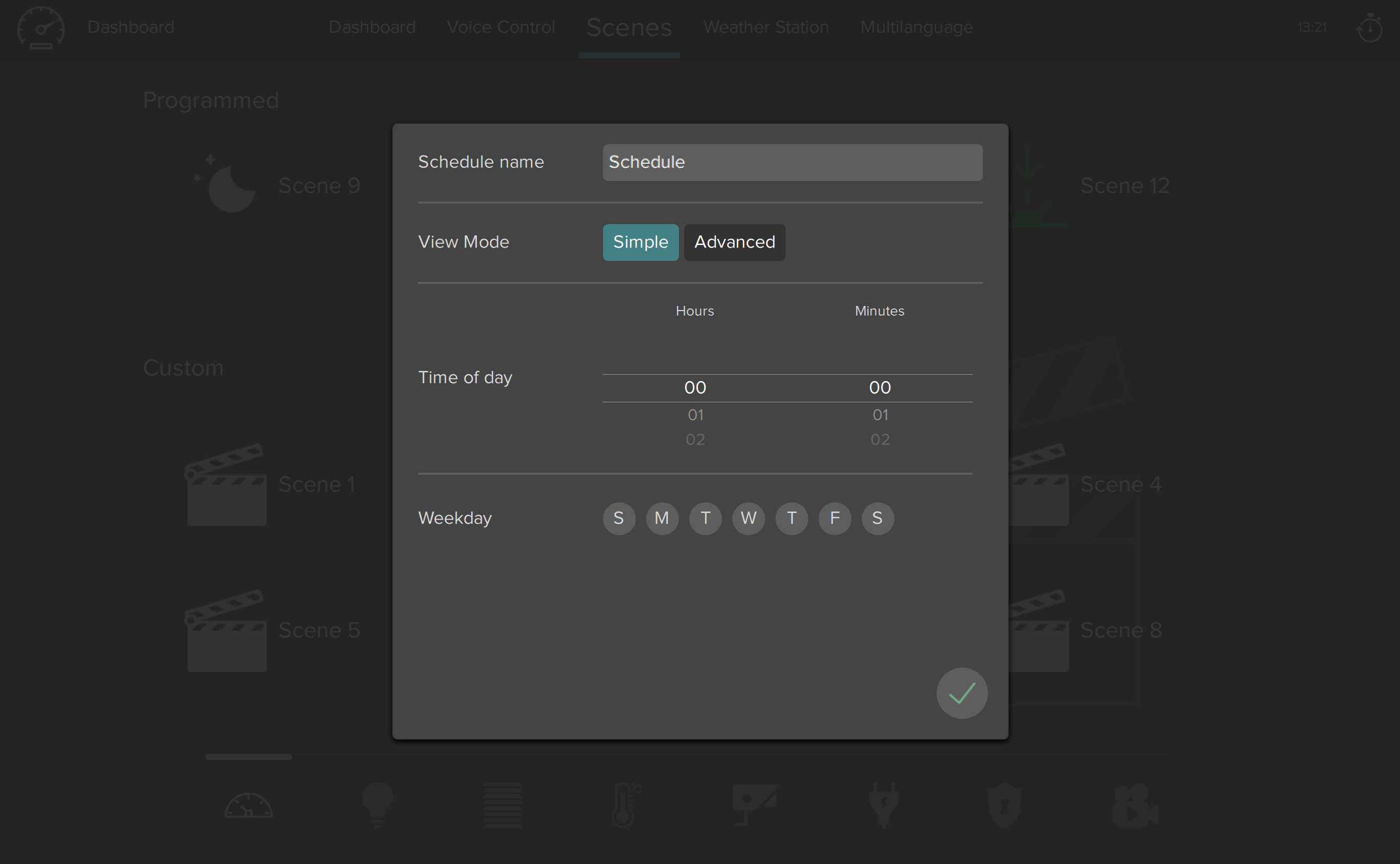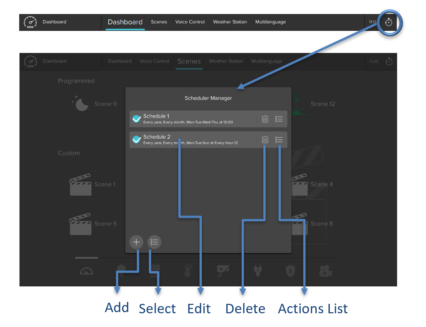 The project interface consists of a left menu holding the main functions created by the integrator. Each function contains a large number of pages which can be changed by swiping left/right or clicking on the title at the upper bar. The Scheduler Manager can be accessed by clicking on the clock icon at the top right corner of the project.