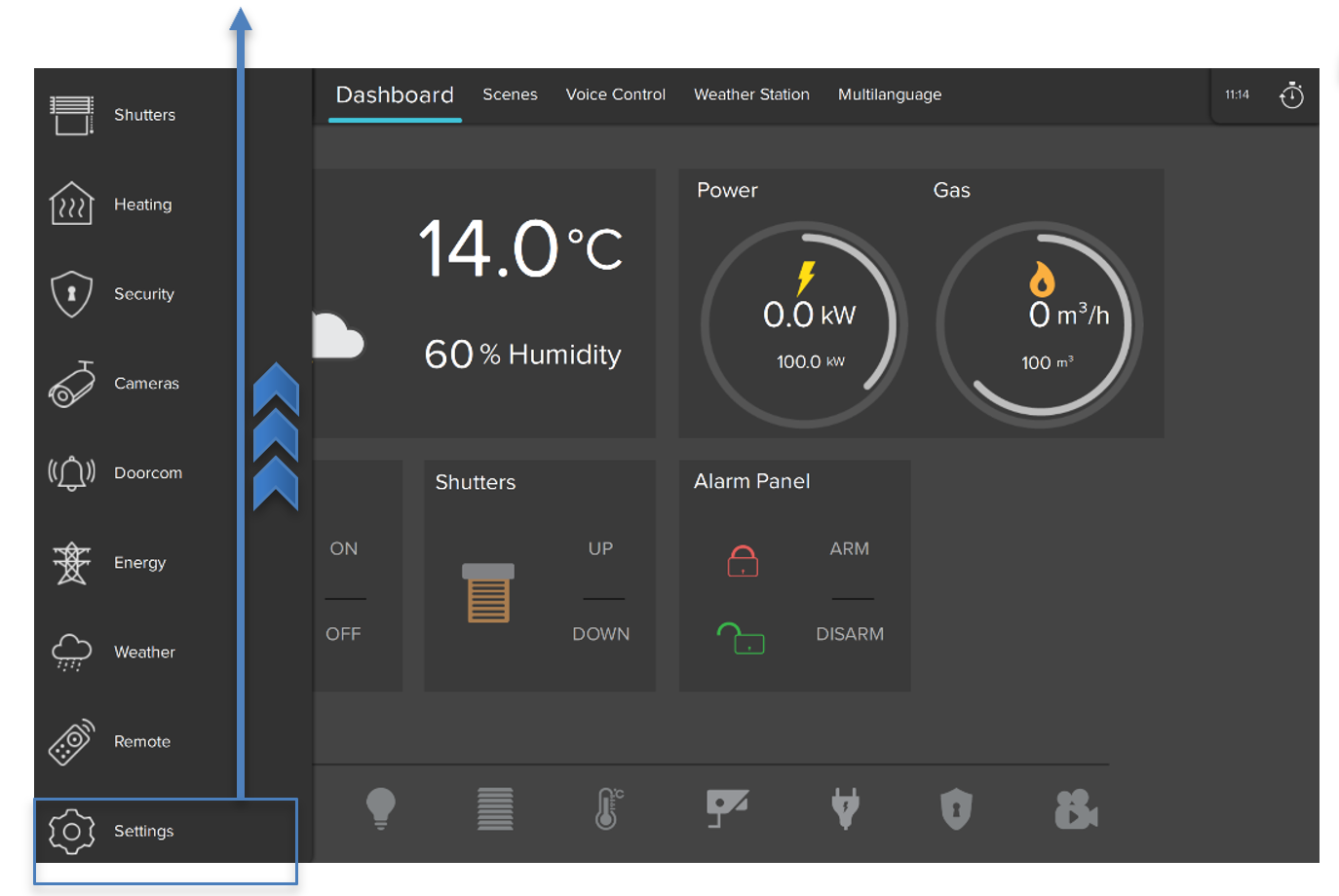 When the client using the Thinknx UP application is configured to be Admin by the integrator, additional functions can be unlocked by accessing the Advanced Settings window.