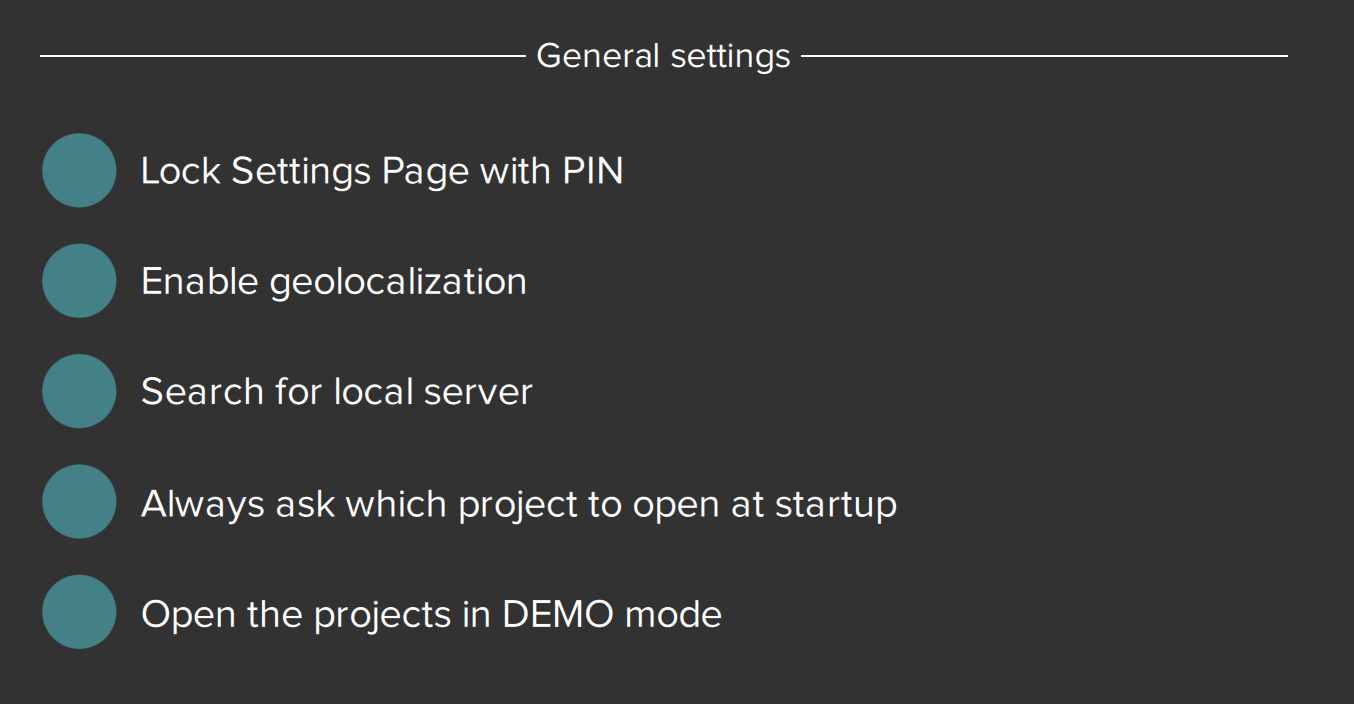 • Lock Settings page with PIN The settings page can be locked with a pin code, allowing the users with access to the pin code to open the page from inside the project.