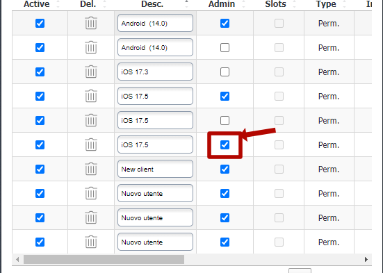 • Manage Clients: permits to view and manage all the clients already authenticated with the server. The administrator can delete, add, and edit the users. Users can also be temporarily deactivated, or only allowed to access the application within a pre-defined time slot.