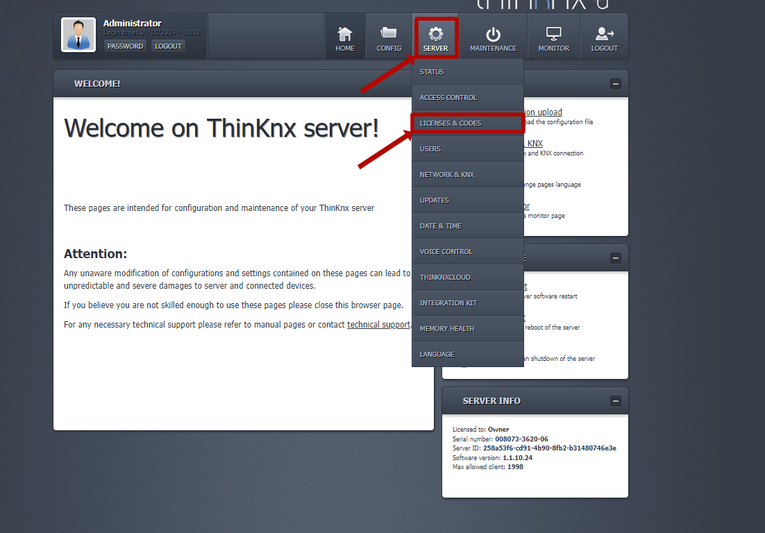 Once the Thinknx project has been uploaded to the server, codes shall be generated by the Manager when needed using the server's web page.
