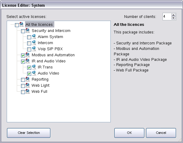 Click on “Edit” button to access the licences editor. Single licences, and packages can be selected in the licences editor window. For more details refer to section 2.1.3.