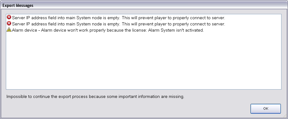 Launching the exportation, the Configuration displays the error window containing messages that warns about the empty IP address slot and the missing licences.