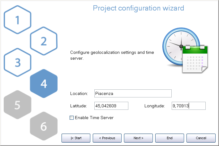 - Step 4 The name and even the geographic coordinates of the location where the server is installed should be typed in this section. These data will be used on clients when the geolocalization feature is active. These settings are mandatory if the sun calculator object is added to system. Check the box ”Enable Time Server” to use the server as time and date source for KNX devices. Server will synchronize with NTP time server if an internet connection is available.