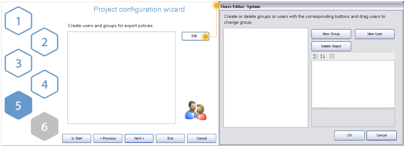 - Step 5 If the plant will be managed by different users and different user interfaces for each user has to be created than it is necessary to create users and groups to be used for export policies. It is possible clicking on the ”Edit” button to access the users editor window. For more details about users creation refer to section 3.1.4 .