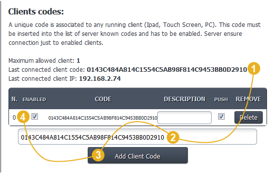The client authentication is done on the server web page, browse in the “Server→Licenses & Codes” and copy the “Last connected client code” and check the “Enabled” box, as shown in the following figure:
