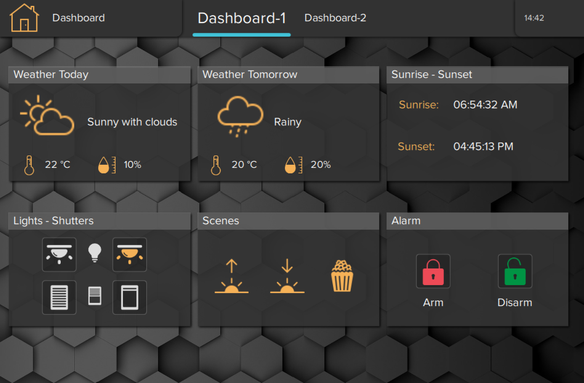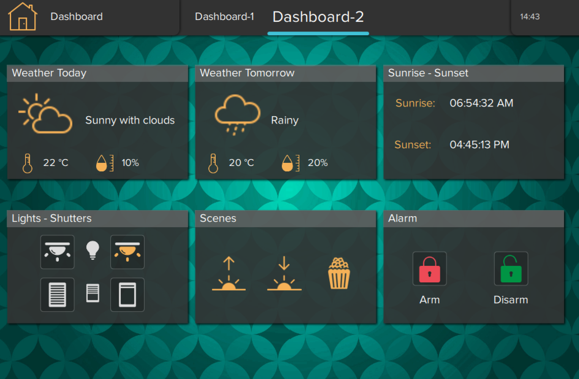These objects, divided into functions, pages and objects, compose the client application GUI. Please refer to the ”User Interface” section. Each object allows the user to check the system status and control the integrated elements. All these objects shares the following