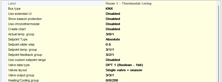 Use custom setpoint range If enabled it permits to choose personalized interval for setpoint temperature valuesGroup for cooling KNX group related to the cooling valve.Group for heating KNX group related to the heating valve.Heating/Cooling group KNX group that give feedback about Heating or cooling mode (0 = Cooling / 1 = Heating)- Fan control If enabled the object controls also the fan speed and new properties will be displayed