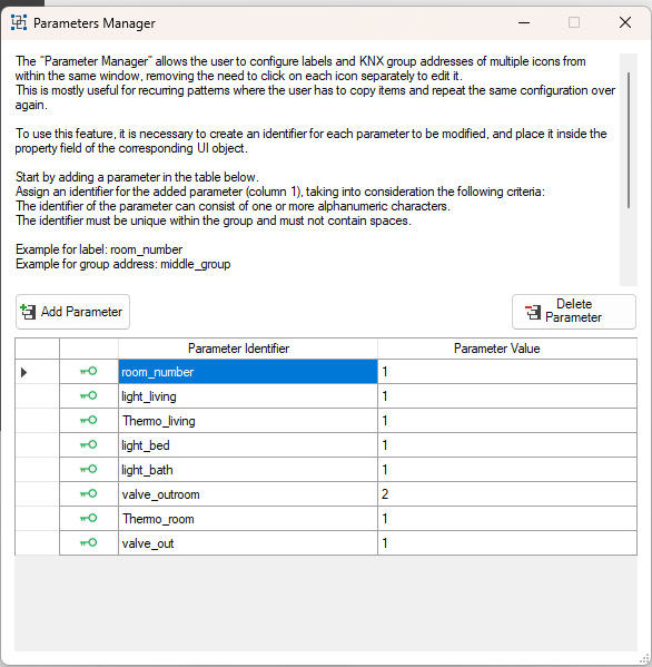- Parameter Manager The “Parameter Manager” simplifies the configuration process for multiple icons by allowing users to configure labels and KNX group addresses within a single window. Users can add parameters with unique identifiers, assign values to them, and then apply these identifiers to icons on the user interface. This streamlines repetitive tasks and ensures consistency across multiple icons. Users simply need to enclose the identifier within curly brackets {} when specifying labels or group addresses for icons.